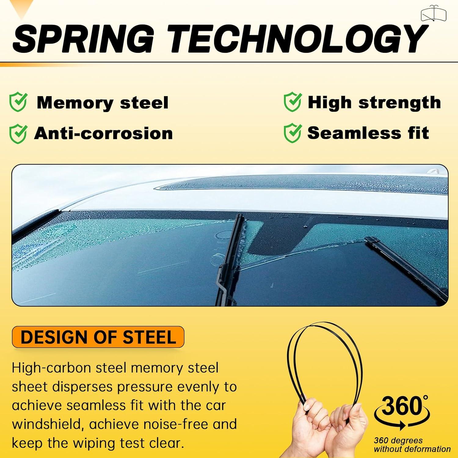 [0 Streak Wiping]Dual high tenacity memory spring steel sheet, coupled with an asymmetrical wind spoiler, deliver uniform pressure distribution and better windshield contact,without leaving any gaps while the wiper working