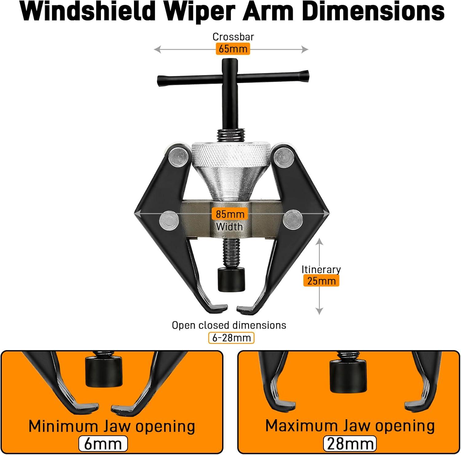 Removes bolted on windshield wiper arms,the puller screw pad is designed to fit the top of the spline post for easy pulling